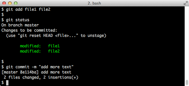 $ git add file1 file2 $ git status $ git commit -m "add more text"Screenshot:
